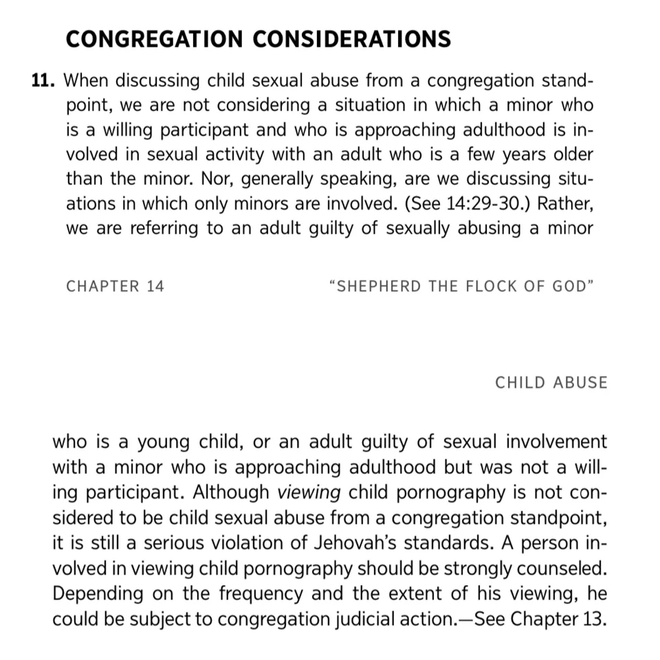 “Will also goes into how Child Pornography is not a Victimless crime. This is stated because the Organization’s Elders manual, Shepherd of the flock of God’ chapter 14 par.11 states that ‘Child Pornography is not considered child sexual abuse from a christian standpoint it is still a serious violation of Jehovah’s standards. A person involved in viewing child pornography should be strongly counseled. Depending on the frequency and extent of his viewing, he could be subject to judicial action”’– even though in reality outside of these organizations, it is illegal and a criminal shameful act. This is one of the many illegal teachings in this organization.